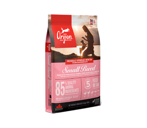 Aprūpinkite savo augintinį visomis reikalingomis maistinėmis medžiagomis su ORIJEN. Mažų veislių šunims reikia biologiškai tinkamo maisto, kuriame gausu įvairios gyvulinės kilmės ingredientų. ORIJEN Small Breed receptas yra specialiai sukurtas mažų veislių šunims. Baltymai gaunami iš laisvėje užaugintos vištienos, kalakutienos, putpelienos bei laukinėje gamtoje sugautos žuvies yra pateikiami specialiai mažiems šunims sukurtose granulėse, kurios yra mažesnio dydžio. Recepte taip pat naudojami organai ir kaulai – pagal viso grobio (WholePrey) principą. Viso to rezultatas – neprilygstamas receptas jūsų augintiniui.